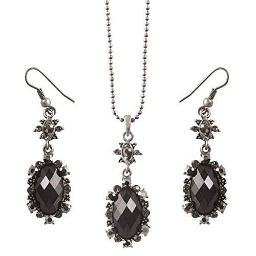 A magnificent rhodium plated retro /gothic design oval drop design set with matching earrings - gift boxed by Crystal Elegance UK. This vintage design offers a perfect way to finish off an elegant, evening look. This is a very high quality item of exceptional value yet does not compromise on style or quality The perfect gift for that someone special or an elegant piece for yourself...Comes in a gold gift box with black sponge velvet lining.Feature