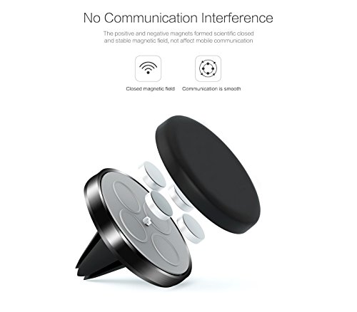 SCIENTIC DESIGN NO COMMUNICATION ISSUE The scientific designed magnets of this magnetic car mount phone holder are what separate it from other universal air vent car mount phone holder; the positive and negative magnets formed scientific closed and stable magnetic filed, which has no interference to the your mobile signal or communication.
