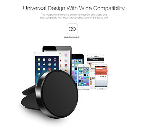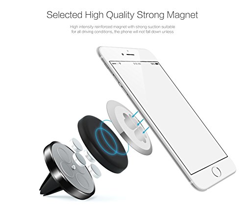 STURDY BASE & WIDE COMPATIBILITY The high quality rubber construction of this magnetic car mount makes it perfectly guarantees the mount hold firmly to air vents & help keep your smartphone tightly during driving regardless of road vibrations or impacts; this universal air vent car mount phone holder produces an intense magnetic attraction which hold most phones including Android Apple Blackberry Microsoft devices such as Samsung S7 iPhone 7 7s 6 6s HTC 10 LG G5 Google Pixel and more.