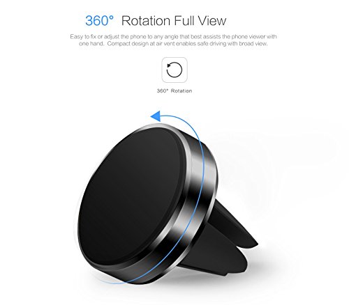 360° ROTATION EASY TO USE The universal air vent car mount phone holder is much easier to use than any other magnetic car mount phone holder due to its simple and pragmatic design;you can rotate your smartphone in 360 degree and swivel your display as you like; the base of the magnet mount remains fixed into the air vent slats of your car and does not move which allows you to choose the best view position for driving.