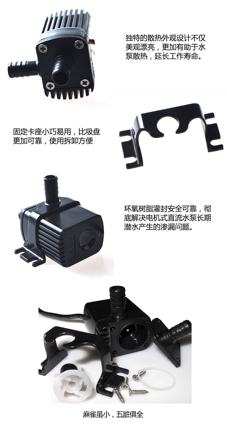 Head: 3 meters Flow: 240L / H Lifetime: 30000 hrs