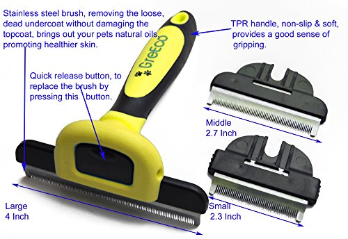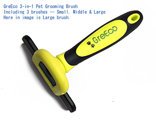 GreEco 3-in-1 DeShedding tool includes 3 different sizes brushes (Small 2.3 inches, Middle 2.7 inches & Large 4 inches), it is designed for all shedding pets -- small to large, short to long haired cats and dogs. If necessary it is so easy to replace the brush by pressing the QUICK RELEASE button.