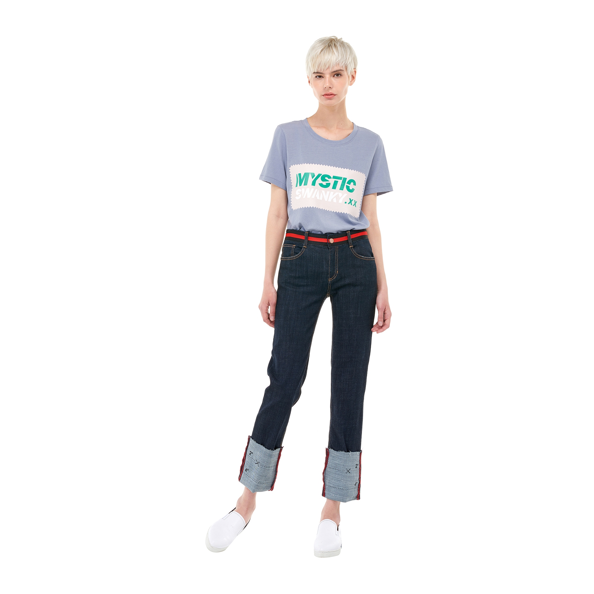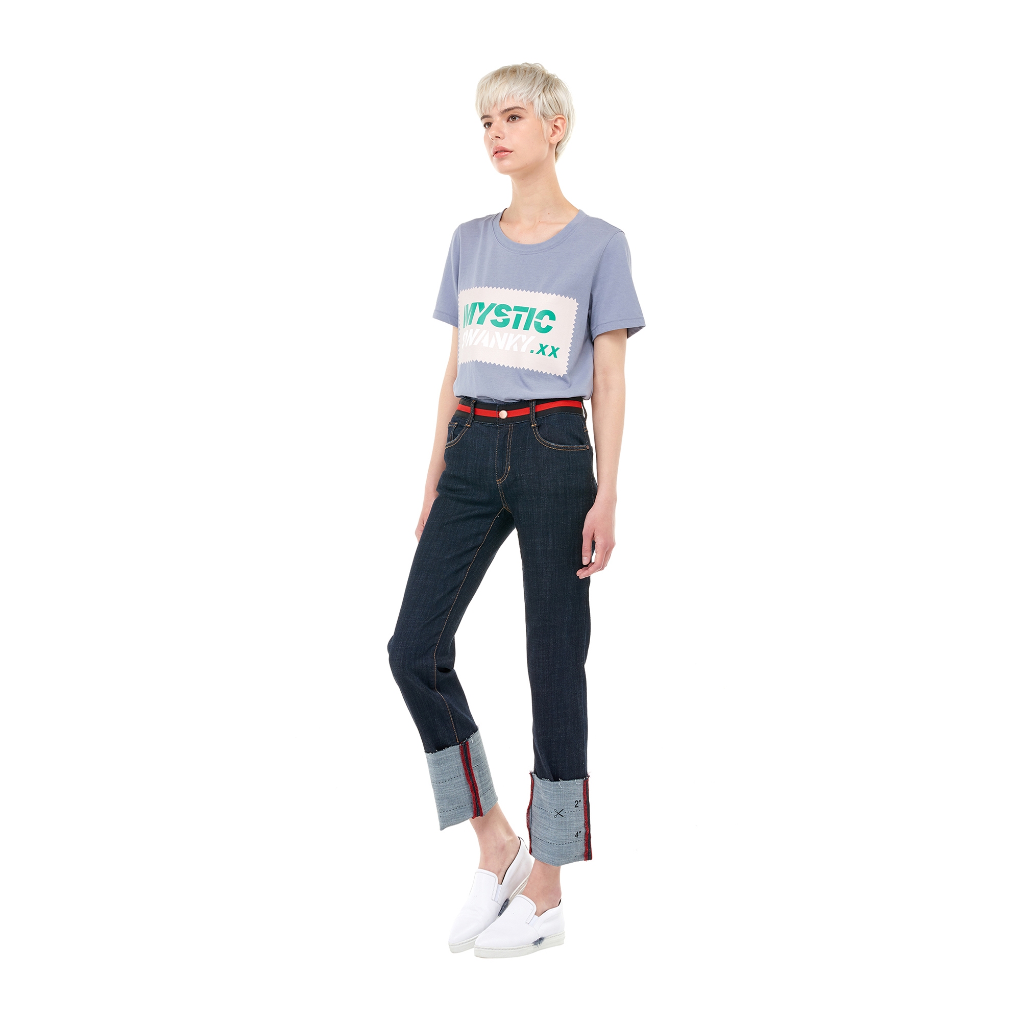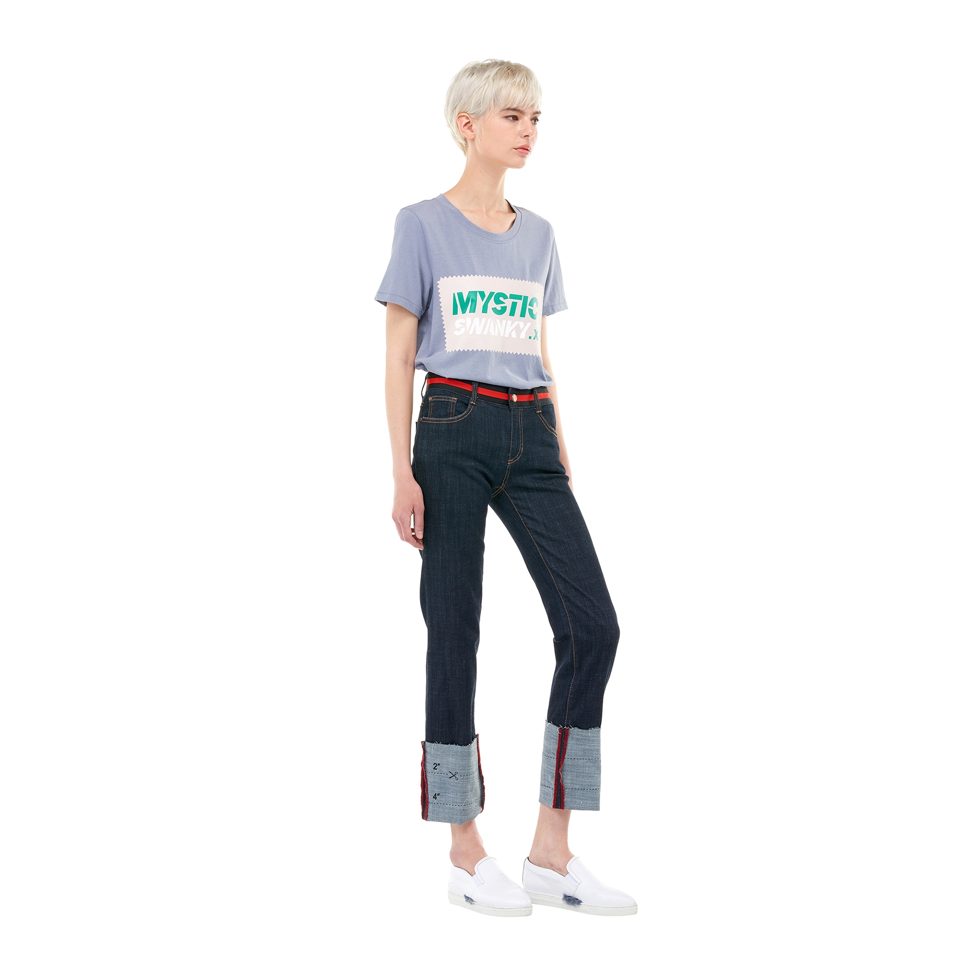 컬렉션 : 2017 Spring/Summer 디자인 포인트 : - 밑단 롤업 디테일이 캐주얼한 느낌을 주는 데님 팬츠- 허리 부분에 컬러 배색 테이핑 디테일이 돋보이는 디자인- 밑단에 유니크한 프린팅을 가진 아이템 스타일링 추천 : 캐주얼한 프린팅 티셔츠 혹은 크롭 티셔츠 등의 아이템을 매치하여 트렌디한 캐주얼룩 스타일링을 할 수 있음