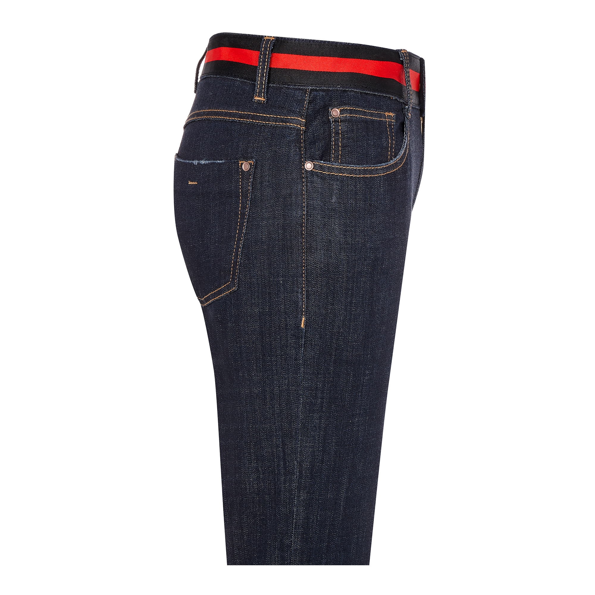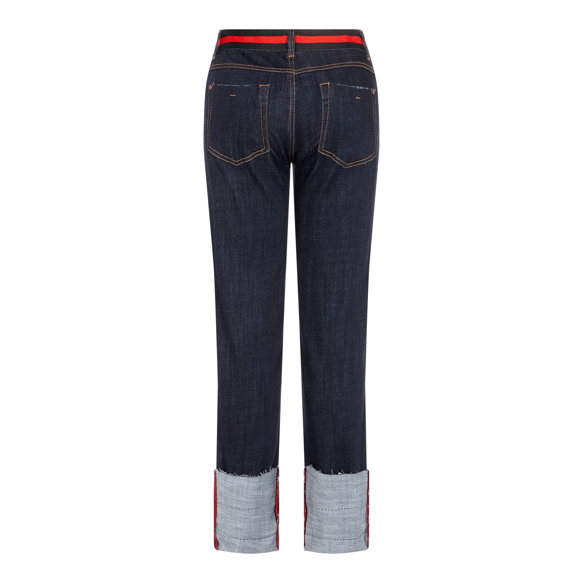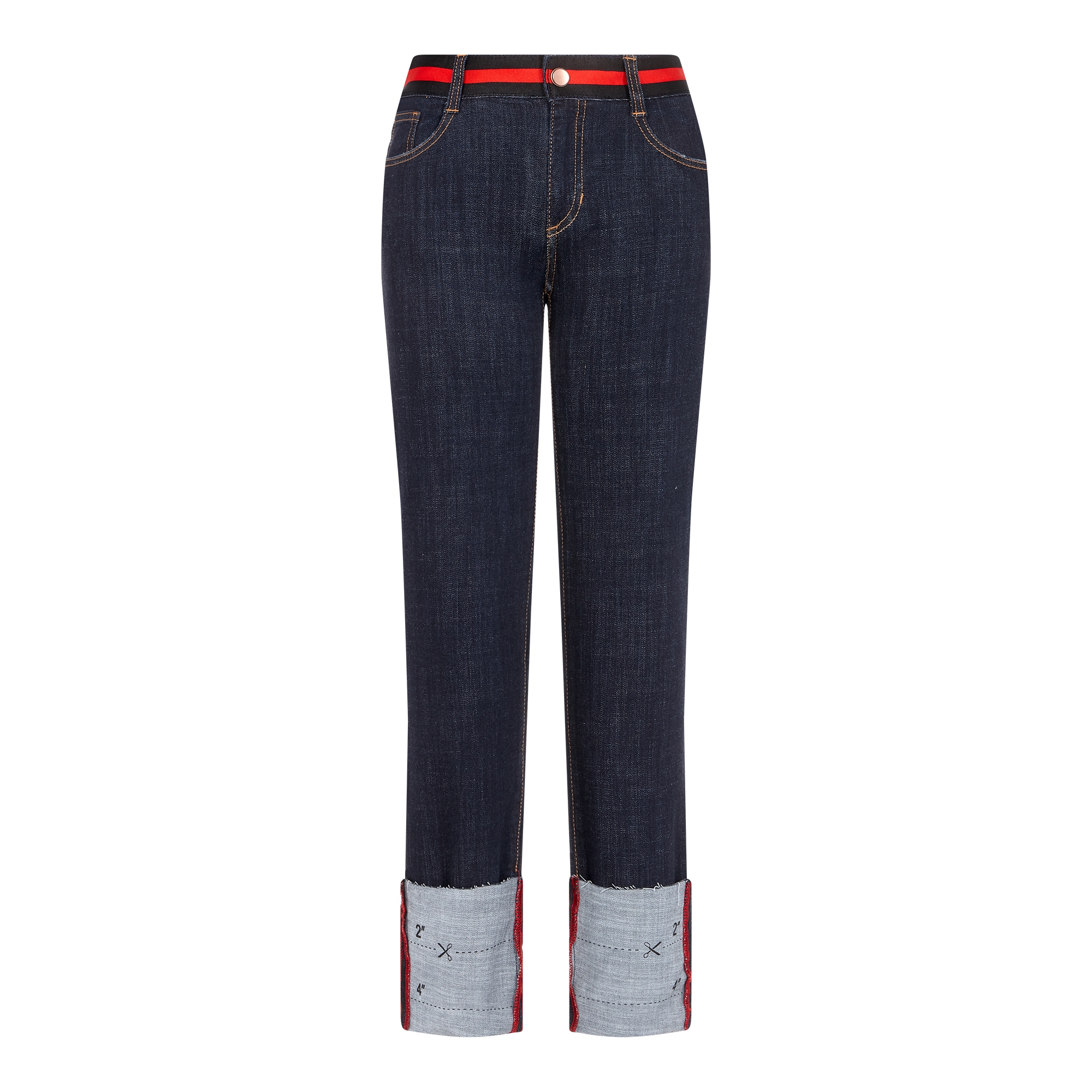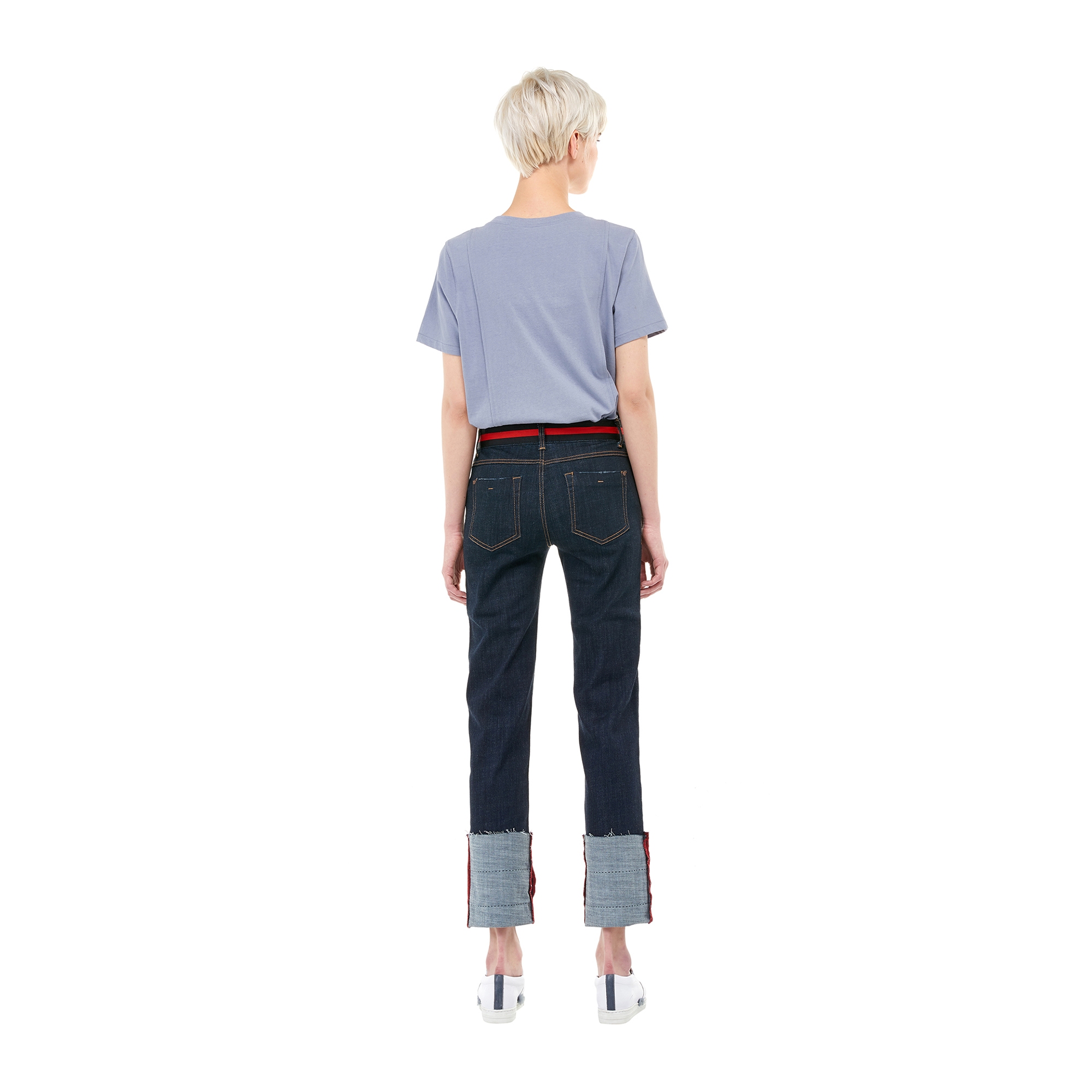 컬렉션 : 2017 Spring/Summer 디자인 포인트 : - 밑단 롤업 디테일이 캐주얼한 느낌을 주는 데님 팬츠- 허리 부분에 컬러 배색 테이핑 디테일이 돋보이는 디자인- 밑단에 유니크한 프린팅을 가진 아이템 스타일링 추천 : 캐주얼한 프린팅 티셔츠 혹은 크롭 티셔츠 등의 아이템을 매치하여 트렌디한 캐주얼룩 스타일링을 할 수 있음