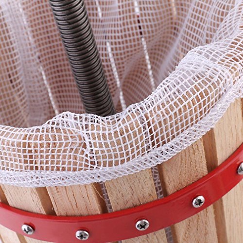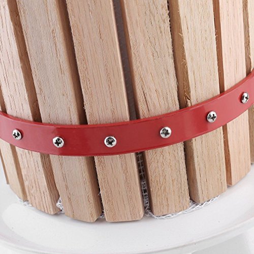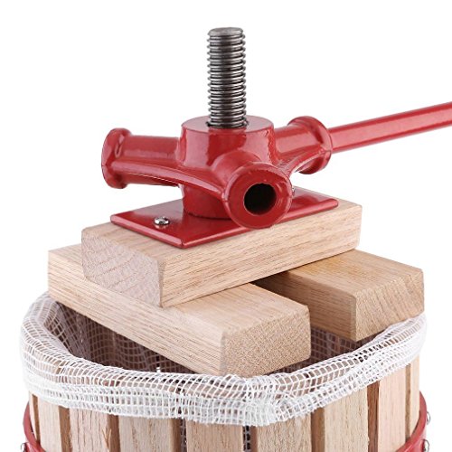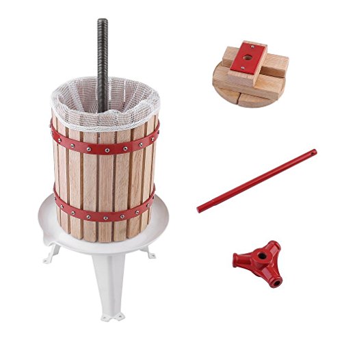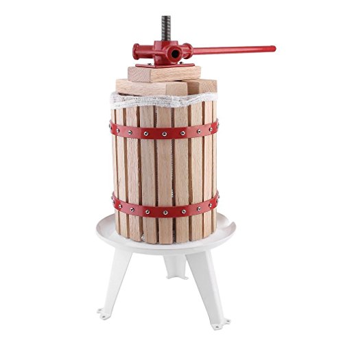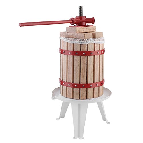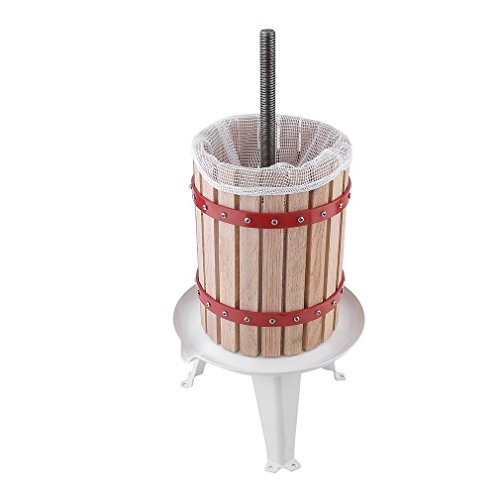 Product Description Description Features: Can be using for apples, grapes or other soft or pulped fruit. Easy to press apples, grapes, pears and other fruit into juice, cider, or wine. Load the crushed fruit into the barrel cage, ratchet down the press, and the juice is squeezed out. Made of oak basket which is moisture proof and resistant to insects. A simple and powerful sturdy fruit press for hobby juice makers. Descriptions: Manual operation allows both to be used inside or outdoors. Durable ratchet handle for dual pressing speed and direction. Simple and heavy-duty tool for whole family to make your own juice, wine or cider. Quick and easy clean up. Specifications: Color:wooden color Material: oak wood, cast iron, steel, press fabric, 100% polyester wood basket capaticy: 6L / 1.6 Gallon Item size: approx.27*27*57cm Package size: approx.28*29.5*58.5cm 0