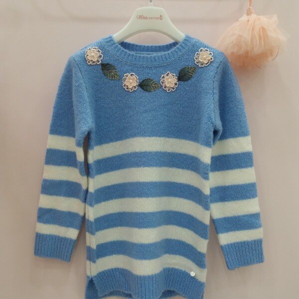 멋스러운 스트라이프 니트에 꽃자수가 넥라인에 고급스럽게 놓아져있는 롱스웨터입니다.폭신폭신하고 부드러운 니트 소재로 따갑지않고 착용감이 우수합니다~