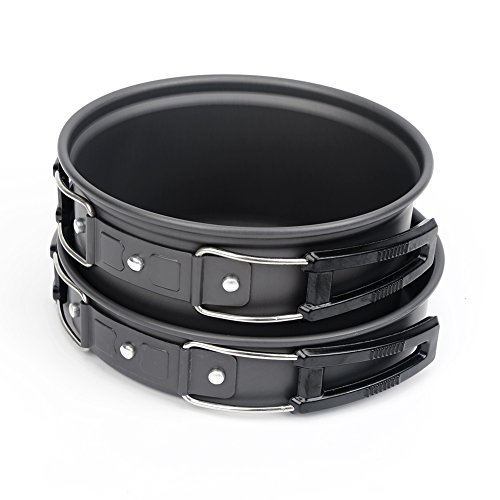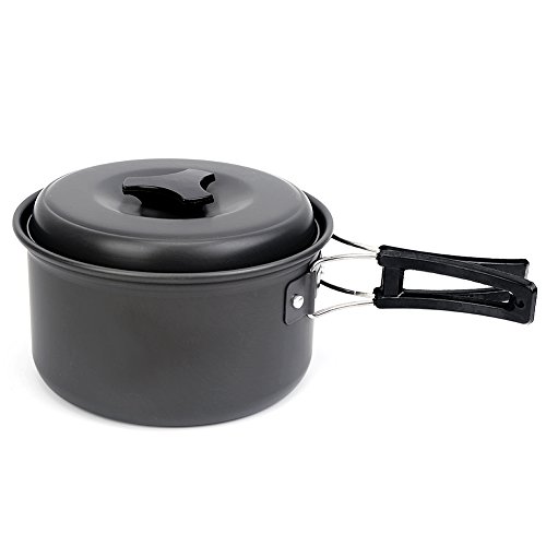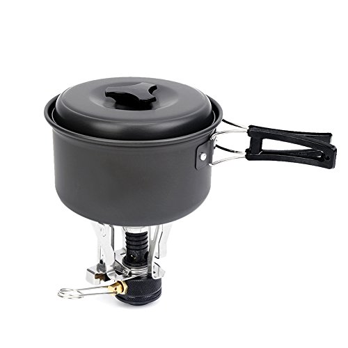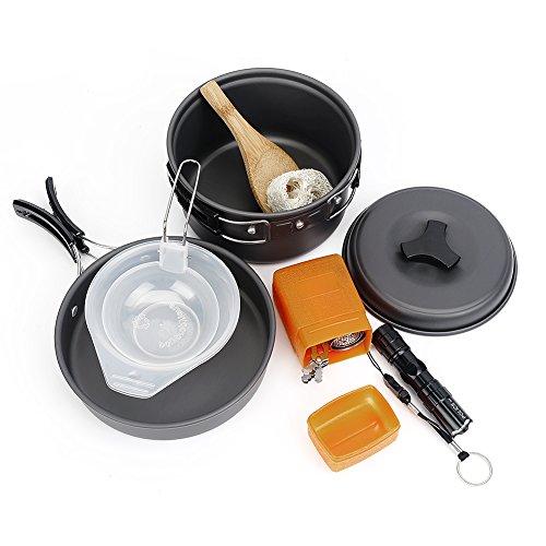 Package Includes:1 x Pot,1 x Frying Pan,1 x Pan Cover,2 x Bowls,1 x Soup Spoon,1 x Rice Ladle,1 x Loofah Sponge,1 x Mesh Bag ,1 x Stove,1 x 3W Flashlight,suitable for 2 people.