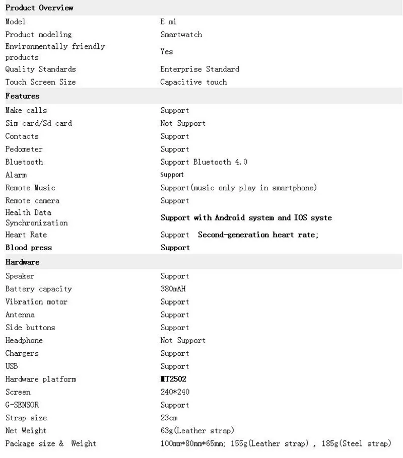 Function:Dial Call,Message Reminder,24 hour instruction,Answer Call,Passometer,Alarm Clock,Small Second,Call Reminder,Calendar,Sleep Tracker,Heart Rate Tracker