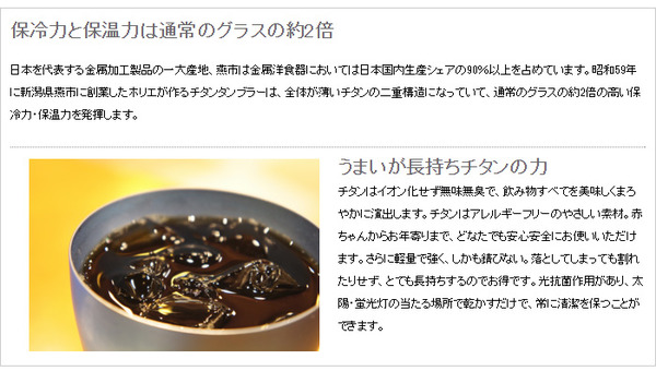 日本を代表する金属加工製品の一大産地、燕市は金属洋食器においては日本国内生産シェアの90%以上を占めています。昭和59年に新潟県燕市に創業したホリエが作るチタンタンブラーは、全体が薄いチタンの二重構造になっていて、通常のグラスよりも高い保冷力・保温力を発揮します。