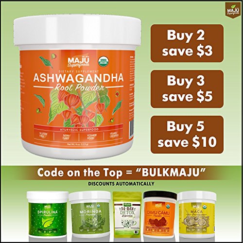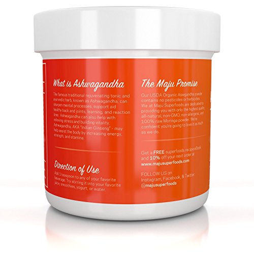 -. Feature : ✹ PURE, POWERFUL ASHWAGANDHA: In order to provide the purest, most potent Ashwagandha, we contacted growers in India, where Ashwagandha originates from. If you try our Ashwagandha Root Powder, you will quickly realize it is in a league of it's own. Our powder is carefully harvested, dried, and ground into an extremely fine powder for easy mixing. This is our standard 4oz jar size. / ✹ MAJU IS DIFFERENT: "Maju" means "to move forward." That's our core belief, in life, health, and nutrition. We created Maju Superfoods while we were students looking for the purest sourced health maximizers. We built Maju Superfoods based on what we wanted ourselves -- pure, clean, and efficient nutrients. You will notice the difference if you give us a shot. / ✹ REDUCE STRESS & ANXIETY, OR YOUR MONEY BACK: Ashwagandha has been known to support stress relief because it regulates cortisol levels. Our Ashwagandha is grown in accordance with the strictest quality standards, is analyzed, and is certified USDA Organic. / ✹ FREE RECIPE eBOOK: Don't know how to use Ashwagandha? No problem, we've got five great recommendations for you in our free recipe eBook, delivered instantly on purchase. / ✹ 30 DAY 100% MONEY BACK GUARANTEE: Try Maju out. Heck, even return an empty jar if you want. If you do not like our product, simply issue refund request. No questions asked.