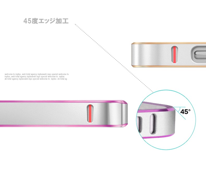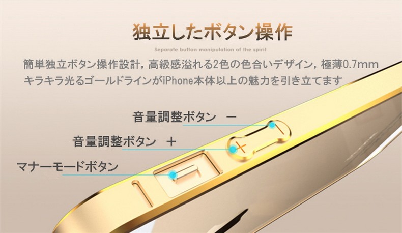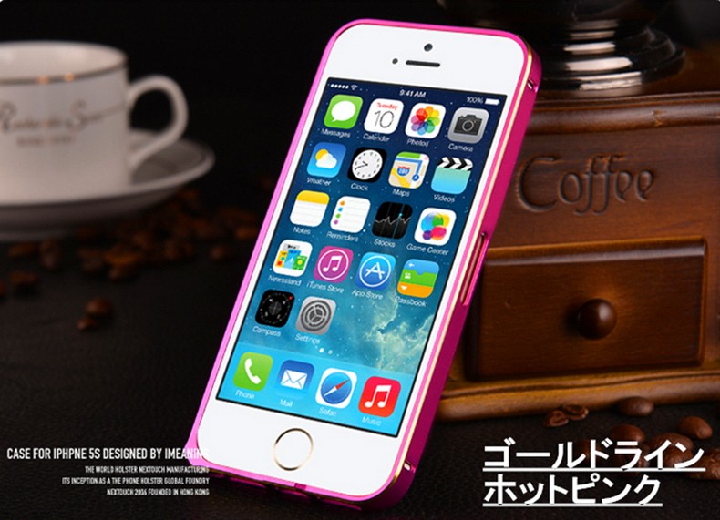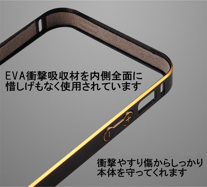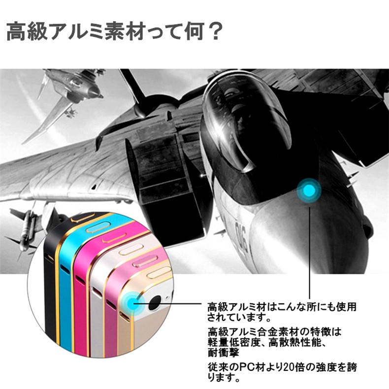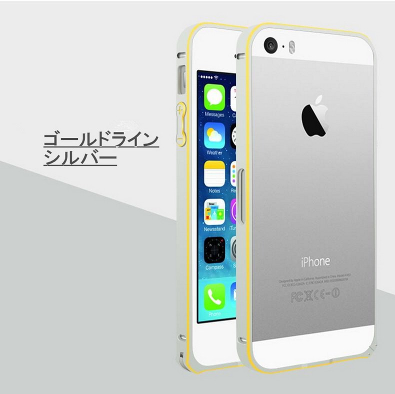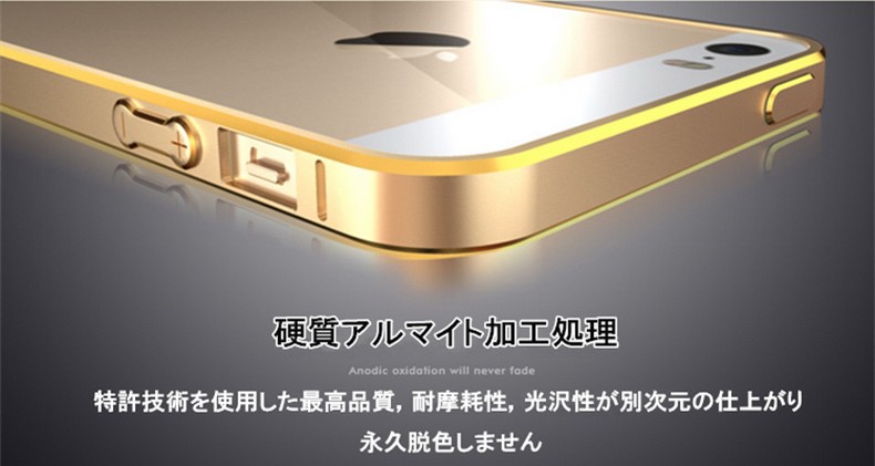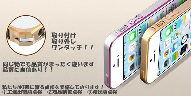 対応機種:iPhoneSE/5/5S重量 :9g 素材 :アルミメタルカラー(全8色)(1) ゴールド&シャンパンゴールド(2) ピンク&シャンパンゴールド(3) ゴールド&シルバー(4) ゴールド&ブラック(5) ピンク&ブラック(6) ゴールド&マリンブルー(7) ゴールド&ホットピンク(8) ゴールド&ピンク最新版頑丈な超軽量設計9g!アルミ素材を使用したiPhoneSE/5/5S専用高品質メタルバンパー。ネジ留めが不要なワンタッチ装着!バンパー内側のコーナーには0.1mmのラバーインナー付きで、衝撃を万全に吸収し、iPhone本体との接触部分への傷付きから保護します。電波を遮断しない為に電波受信口がもうけられています。iPhoneの四隅のアンテナ部分は電波を遮断しないように削りだして、通話やネット通信回線を邪魔しない設計がなされています。全ての機能がそのまま使える充実感。ワンタッチ脱着のバックル方式、バックルで固定する簡単で強力な固定方法を採用。工具が不要なので届いたその時からすぐに装着できて、気分に応じて簡単に脱着できます。