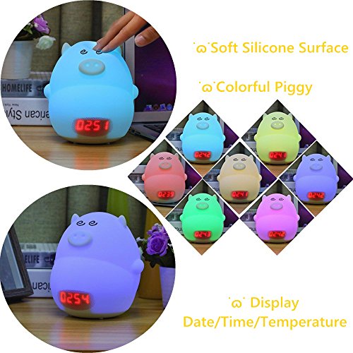★ MULTIFUNCTION: The piggy night light can not only be used as night light but also be used as kids alarm clock. It can display calendar, time and temperature. When you pat the night light, it will make sounds(sow or piggy), so it is a good friend for kids.