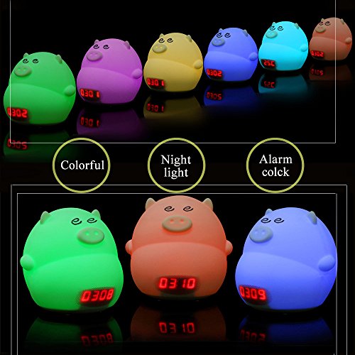 ★ APPEARANCE: Silicone material, soft and lovely piggy face, this night light is suitable for children, kids and baby. The light alarm's silicone parts can be washed. There are7-color changing light modes and stand by mode for you to choose.