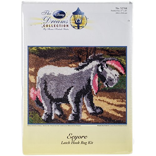Eeyore latch hook rug kit. 12th in the series of 12 Disney Dreams Collections. Our finished size 27" x 20" latch hook rug kit comes complete with easy-to-follow full color chart, blank Graph N' Latch(r) 3.75 mesh rug canvas with Blue Lined Grid for easy counting and perfect rugs every time plus MCG Textiles 100-Percent acrylic pre-cut rug yarn. Kit requires latch hook tool and rug binding to complete. 2013 Thomas Kinkade Studios, Disney elements at Disney. Based on the "Winnie the Pooh" works by A.A. Milne and E.H. Shepard.Feature