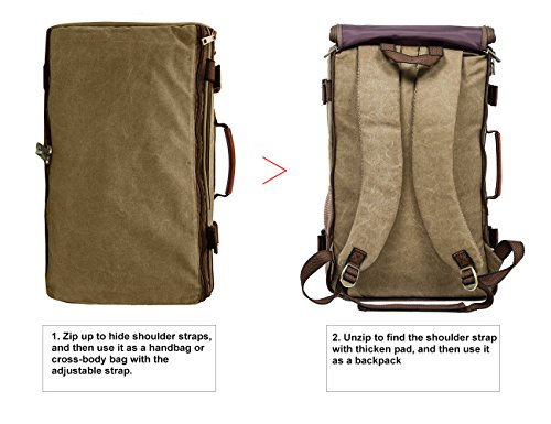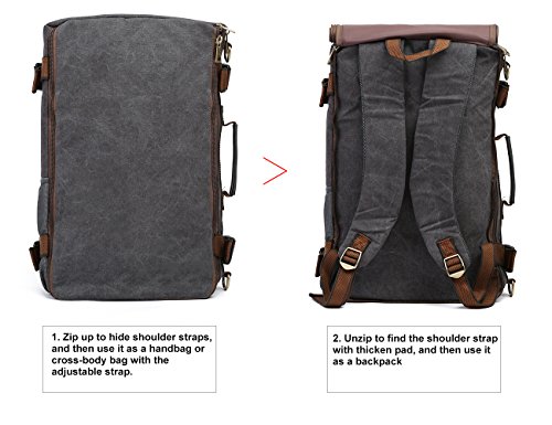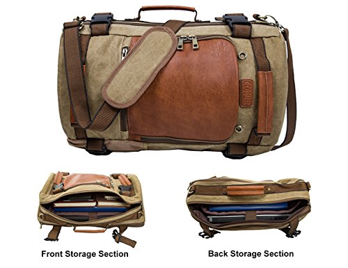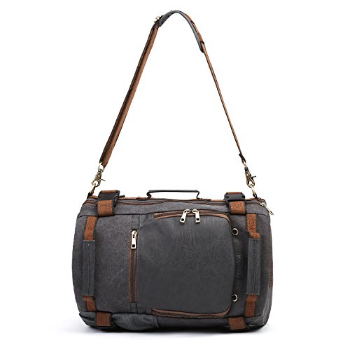 -. Feature : High density canvas backpack features a classic style and decoration with faux leather / Overall dimensions: Approx18.5"(L) x 6.3"(W) x 14.5"(H) Weight: 2.6 pounds; The padded notebook compartment can fits up to 17" Laptop / This canvas backpack can use as duffle / handbag / backpack / briefcase / shoulder bag/ messenger bag; One bag offers at least four different ways of carrying / Lots of pockets: 1 zipper main compartment, 2 zipper front pockets and 1 side pocket. With 2 zippers on the main compartment / Awesome backpack for outdoor, working, traveling, hiking, camping, school and everyday using