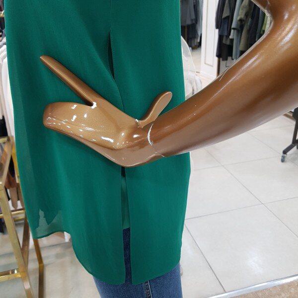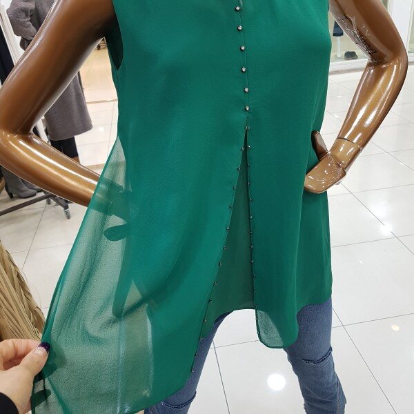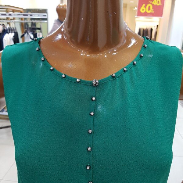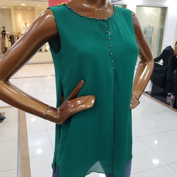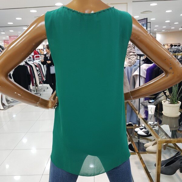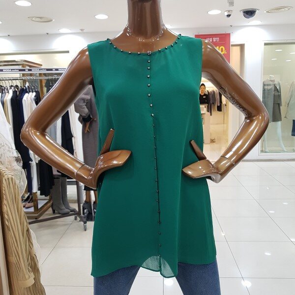 큐빅장식이 포인트인 민소매블라우스 디자인입니다.