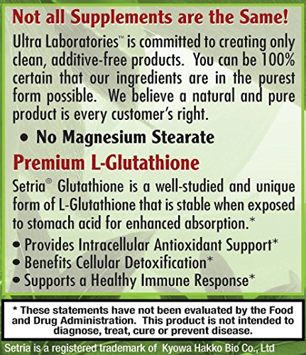 -. Feature : Provides intracellular antioxidant support, benefits cellular detoxification, and supports a healthy immune response. / 30 Capsules / Gluten Free. Additive-Free. No Magnesium Stearate. No Fillers. No Chemicals. / Dietary supplement guaranteed to be FREE of milk, corn, soy, salt, sugar, wheat, yeast, artificial flavors or preservatives. / Not all Supplements are the Same! Ultra LaboratoriesTM is committed to creating only clean, additive-free products. You can be 100% certain that our ingredients are offered to you in the purest form possible. We believe a natural and pure product is every customer's right.