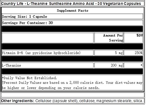 -. Binding : Health and Beauty -. Brand : Country Life -. EAN : 0015794014119 -. Feature : Has been shown to promote deep sleep and muscular relaxation / Can promote a relaxed and restful state of mind / Natural amino acid -. Label : Country Life -. Manufacturer : Country Life -. MPN : 1411 -. NumberOfItems : 1 -. PackageQuantity : 1 -. PartNumber : 1411 -. ProductGroup : Health and Beauty -. ProductTypeName : HEALTH_PERSONAL_CARE -. PublicationDate : 2010-08-02 -. Publisher : Country Life -. Size : 30 -. Studio : Country Life -. Title : Country Life L-Theanine, 200 mg, Vegetarian Capsules, 30-Count -. UPC : 015794014119