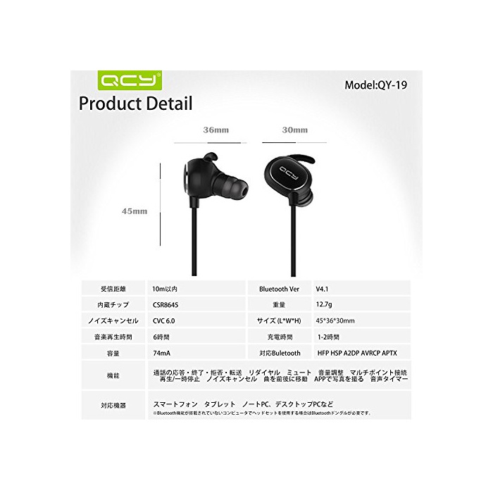 원본상품명: QCY QY19 イヤホン bluetooth 4.1 aptX 高音質コデック ワイヤレス IPX64 防水 スポツ CVC6.0 ノイズキャンセル メカ保12カ月