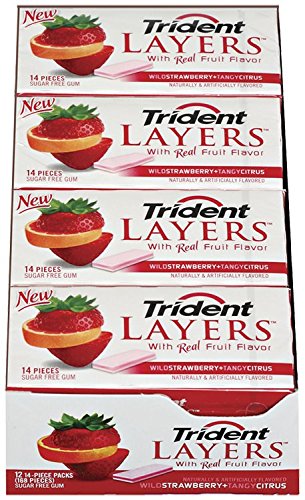 -. Feature : Get close-up confidence with Trident Layers Sugar Free gum, the easy way to freshen breath and help protect against tooth decay. / Trident Layers makes gum fun by swirling mouthwatering Wild Strawberry & Tangy Citrus flavors together, creating a unique gum chewing experience that deeply satisfies any set of taste buds. / With 50% fewer calories than sugared gum, Trident Layers has long lasting flavor, fights plaque, and restores your mouth's pH balance to maintain a healthy smile. / Four out of five dentists recommend chewing Trident after eating and drinking to clean and protect teeth. / This order includes 12 14-stick packs of Wild Strawberry & Tangy Citrus Trident Layers Sugar Free Gum.
