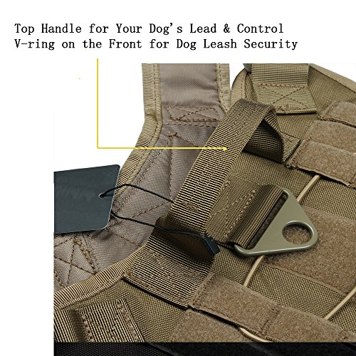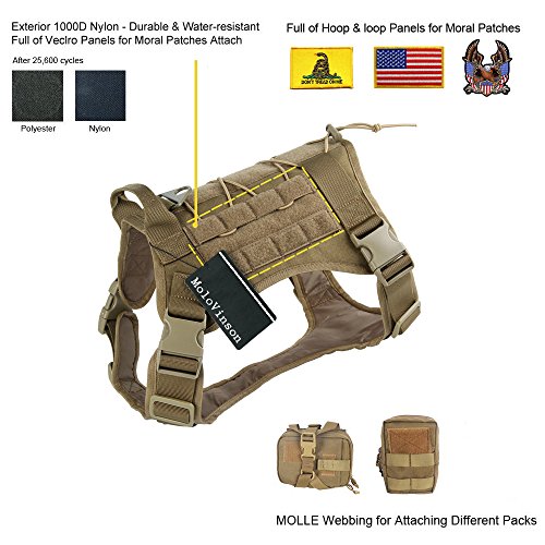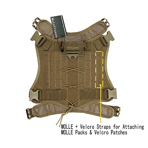 -. Binding : Misc. -. Brand : MoloVinson -. Feature : Durable Material & Soft Padded: Made with our high quality 1000D nylon and well padded in all pressure areas for a comfortable fit / Easy Adjustable Dog Harness: 4 quick release buckles for easy put on and off while providing extra security; With one top handle for your dog's lead & control and one V-ring on the front for dog leash attachment / MOLLE System: There are two rows of MOLLE straps on each side of the vest,provides a molle compatible to carry the essentials for your trip / Hook and Loop Panels for Attach Morale Patch: One full length strip of 9"long 2" wide heavy duty loop panel on the top for ID badges; One 3.5"long 2" wide loop panel on the neck strap / Available in 3 colors & 2 size; Measure around your dog's chest to get the right fit (Reference to the picture) -. Label : Spanker -. Manufacturer : Spanker -. PackageQuantity : 1 -. ProductGroup : Pet Products -. ProductTypeName : PET_SUPPLIES -. Publisher : Spanker -. Studio : Spanker -. Title : MoloVinson Tactical Dog Training Vest MOLLE Water-resistant Comfortable Military Patrol K9 Service Dog Harness with Handle for Small Medium Large Dog