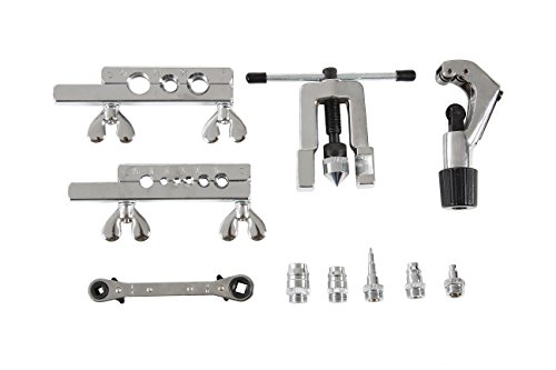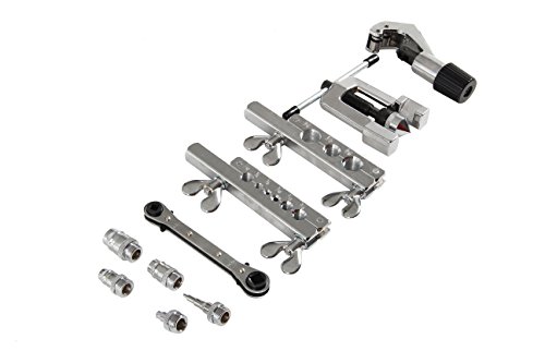 WIDE RANGE OF FLARE ADAPTERS: flaring tool adapters range from the following sizes: 1/8", 3/16", 1/4", 5/16", 3/8", 7/16", 1/2", 5/8", making this the only flaring tool set a mechanic will need. (Metric: 5mm, 6mm, 8mm, 10mm, 12mm, 14mm, 16mm)