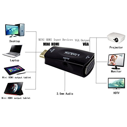 The LinkS Mini HDMI-to-VGA Adapter Cable enables you to connect an Mini HDMI output device, such as a laptop video output or digital media extender to a VGA display device (monitor, projector)