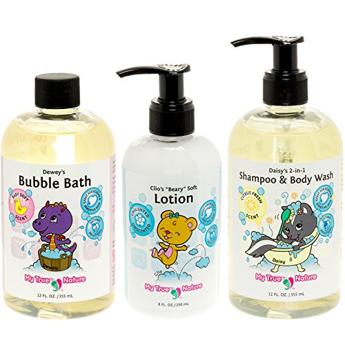 -. Feature : MADE FROM ALL NATURAL INGREDIENTS - My True Nature is dedicated to creating fun products that are good for the environment and your little ones. This set of gentle shampoo and body wash, lotion and bubble bath are made of natural plant-based ingredients and botanicals, such as aloe leaf juice, plantain and white peony tea extracts, and organic shea butter specifically crafted to give your family an all-natural cleansing solution that calms, nourishes and soothes. / FREE OF THE "ICKIES" - Feel confident that you're using only the best ingredients on your kids' skin. My True Nature's naturally formulated products use absolutely no GMO's, parabens, petrochemicals, phthalates or harmful sulfates, and is also dairy free, gluten free, and nut free. / IDEAL FOR SENSITIVE SKIN - Free of synthetic dyes or fragrances, triclosan and harsh preservatives, this set of gentle cleansers won't irritate the skin, making it ideal for those with sensitive skin or various skin issues, such as eczema or cradle cap. / MEET THE RESIDENTS OF TUBBYTOWN - Daisy, Dewey, and Clio are here to make getting clean that much more fun! Kids will love their fun, new bathtime buddies, and you'll love that it let's their imagination soar. / PRODUCT SPECIFICATIONS - Set includes Dewey's Bubble Bath, Daisy's 2-in-1 Shampoo & Body Wash, and Clio's "Beary" Soft Lotion. Cruelty free; Manufactured in the USA. Packaged in 100% FDA approved post-consumer PET plastic. Use only as directed.