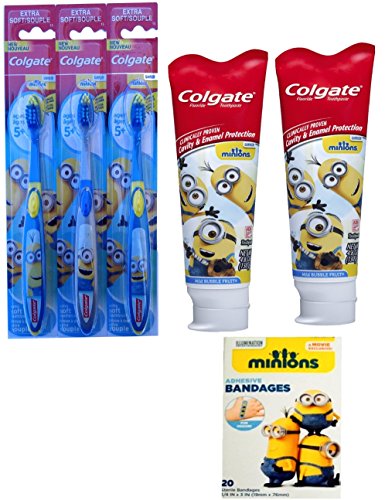 -. Title : Despicable Me "Minions" All Inclusive 6pc Bright Smile Oral Hygiene Set! (3) Minion Soft Manual Toothbrush (2) Colgate Minions Mild Bubble Fruit Toothpaste (1) Minions 20ct Adhesive Bandages