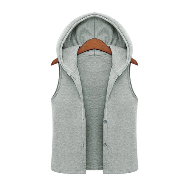 Sleeveless hoodie vest with button fastening.