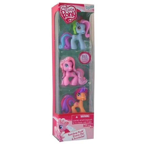My Little Pony Rainbow Dash Pinkie Pie and Scootaloo are cute and fun to play with! Each has a removable wig. For ages 4 . Every day you and the ponies can set out to explore the wonders of "Ponyville". 0