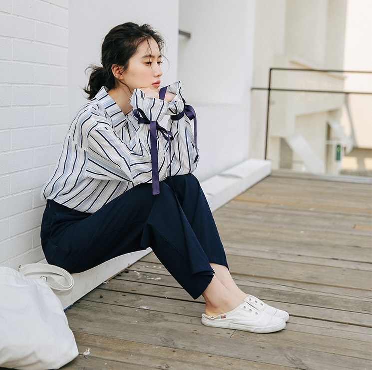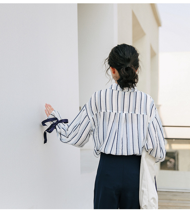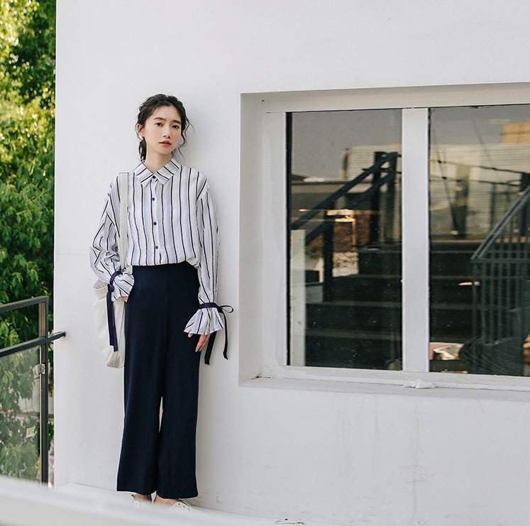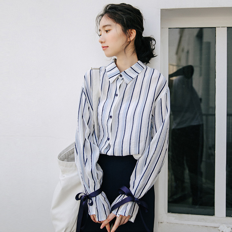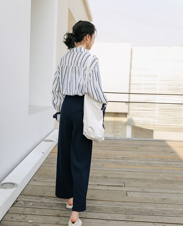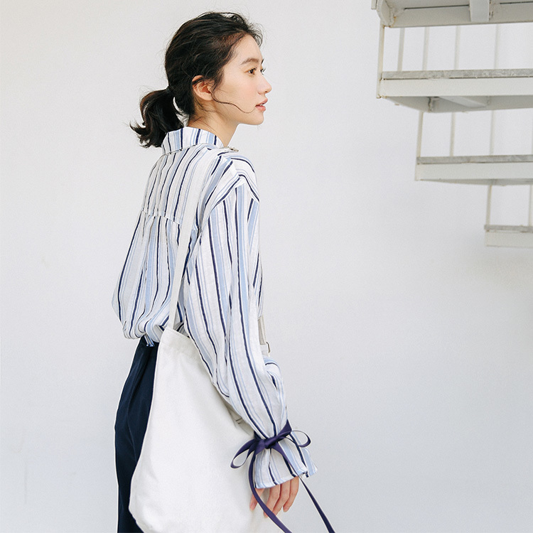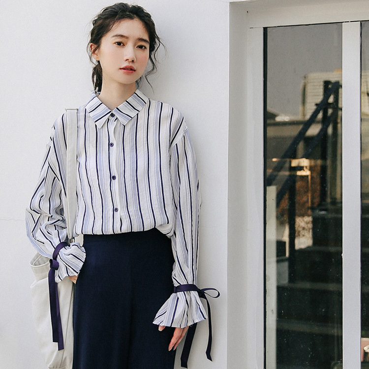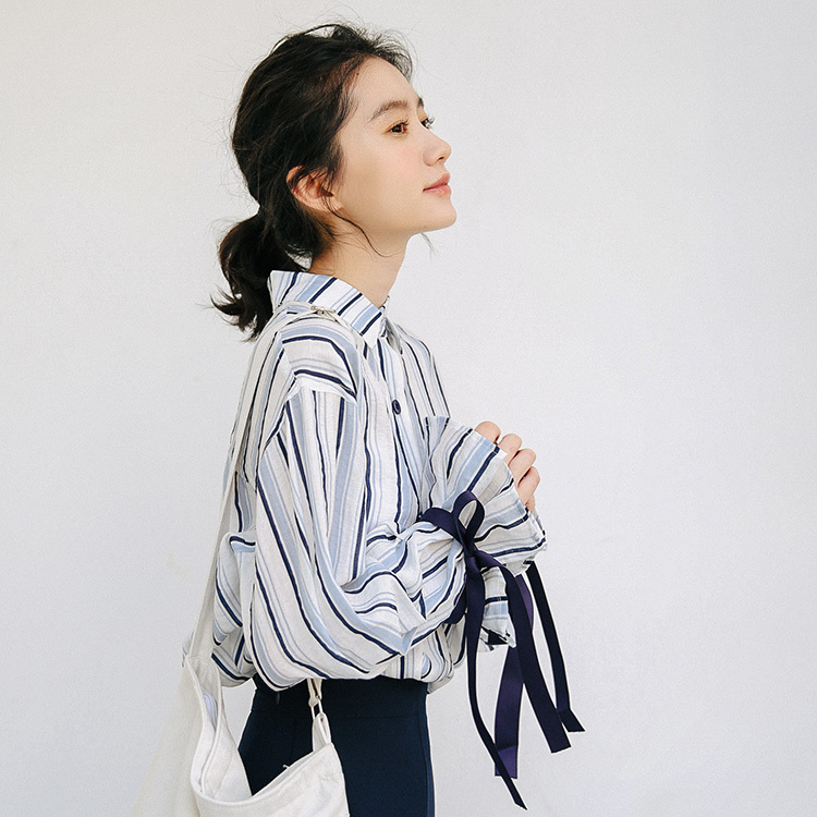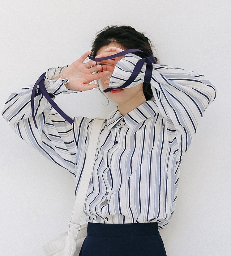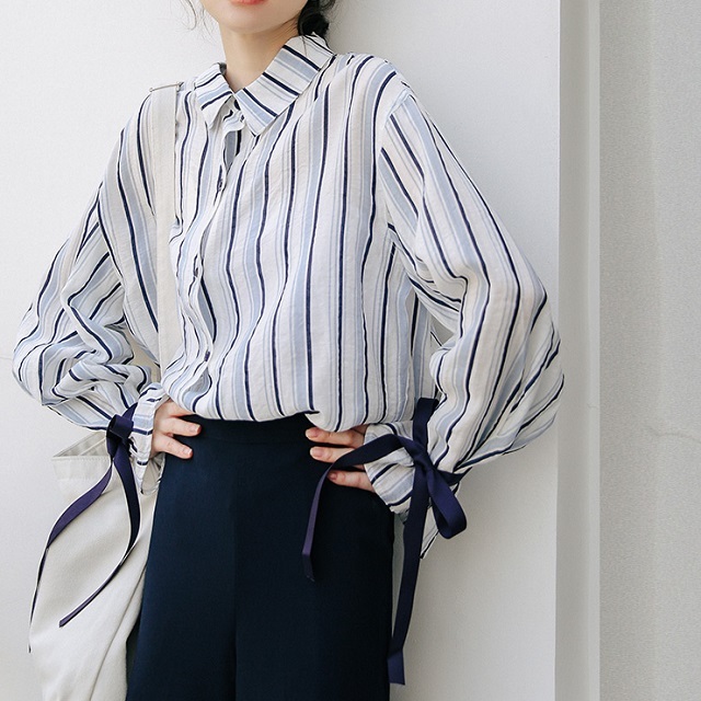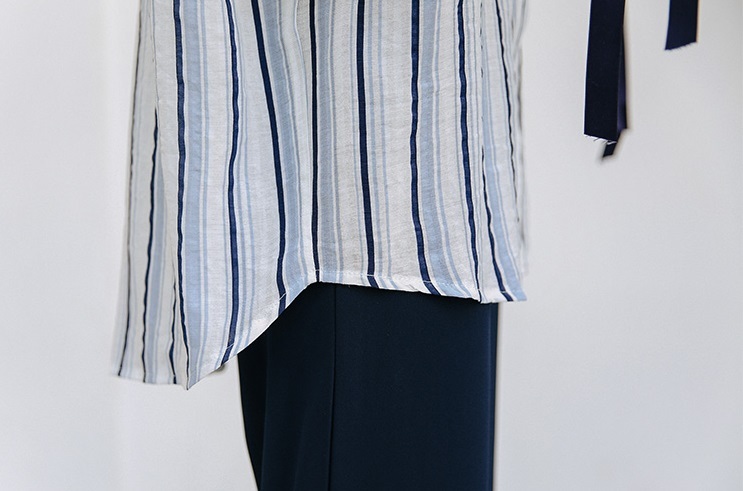 爽やかなブルーカラー系のマルチストライプで、グッと大人っぽい着こなしに仕上がるシャツです。