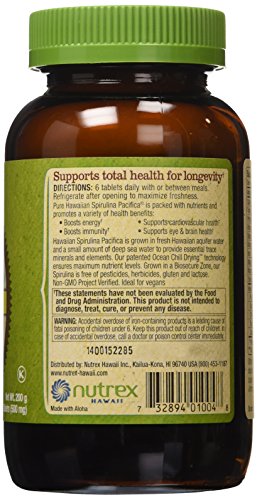 Supports Total Health for LongevityPure Hawaiian Spirulina Pacifica is packed with nutrients and promotes a variety of health benefits:Supports cardiovascular healthSupports eye & brain healthBoosts energyBoosts immunityOnly pure Hawaiian Spirulina Pacifica is grown with deep sea water containing all 94 trace minerals & elements and uses our patented Ocean Chill Drying technology to ensure maximum nutrient levels. Grown in a Biosecure Zone, our Spirulina is free of pesticides, herbicides and GMO's. Ideal for vegetarians.Feature