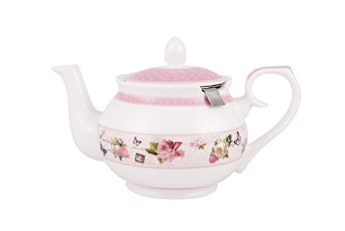 -. Feature : Charming, vintage style, butterfly and rose teapot and infuser set. / Made of fine bone china. / Teapot measures 5.5 inches tall, holds approximately 22 fluid ounces, and comes with a metal infuser. / Includes a coordinating gift box for easy, elegant gifting. / Microwave and dishwasher safe.