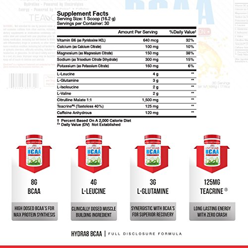 8g of BCAA's: While most BCAA formulas include BCAA's, many give you just 5 grams. HYDRA8 BCAA includes 8 grams of all the branch chained amino acids at the scientifically validated 2:1:1 ratio.
