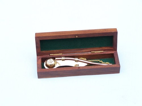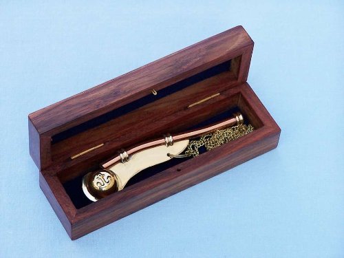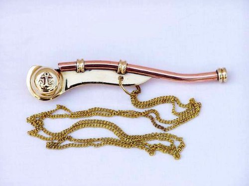 The Hampton Nautical Boatswain's Pipe (pronounced inchbosun's inch) is one of the oldest and most distinctive pieces of nautical equipment. The boatswain's pipe, whistle, or flute, was used in Greece and Rome to keep the stroke of galley slaves. This beautifully detailed solid brass and copper Navy Boatswain's Pipe comes with a quality 39 inch solid brass chain lanyard. The pipe has a traditional anchor design inlaid in copper on both sides. The boatswain's pipe measures 5 inches (12.7 cm) long, and the pipe and chain weigh 1.6 ounces (45 grams), and yes, it really whistles.The boatswain's pipe comes with a beautiful solid hardwood felt lined storage and display case. Solid brass and copper no plastic parts 39” chain lanyard brass links keep whistle secure Traditional design of a bosun’s pipe Fully functional actually worksFeature