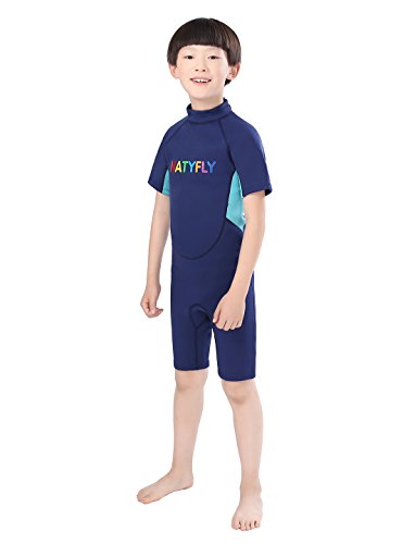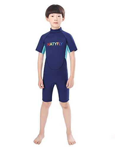 Neoprene Wetsuits for Kids Boys Girls Back Zipper One Piece Swimsuit UV Protection-Brand NatyFly (New Blue-2mm-Short Sleeve, New L-For Height 42”-47”)