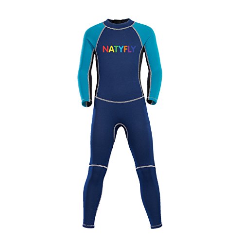 Neoprene Wetsuits for Kids Boys Girls Back Zipper One Piece Swimsuit UV Protection-Brand NatyFly (New Blue-2mm-Long Sleeve, S-For Height 32”-37”)