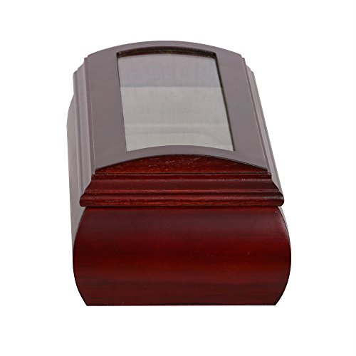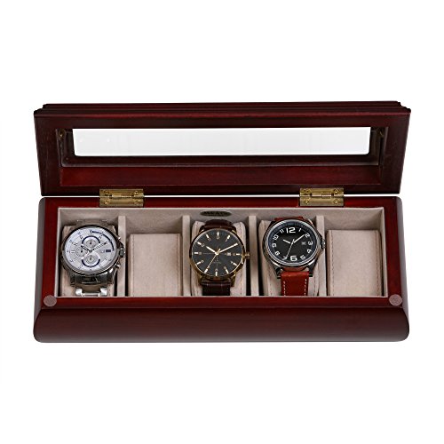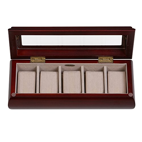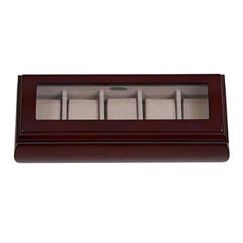 Sleek sophistication and traditional styling combine to make the Mele & Co. Emery watch case a perfect addition to a well appointed dresser top and a great gift for men. The domed glass lid makes a stately presentation and turns this clean lined watch box into an understated watch display case. The removable watch cushions offer customization by allowing for storage of more than just your treasured timepieces. Gold tone sturdy hardware offers smooth access and closure. With its warm cherry finish and compact design, this demure men's valet and jewelry box is a simply exquisite storage solution. Dimensions: 11 1/8" W x 4 1/2" D x 3 1/4" H.Feature