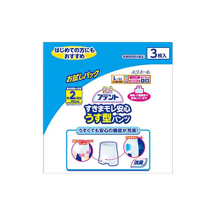 원본상품명: 【お試しパック】 アテント すきまモレ安心うす型パンツ L-LLサイズ 男女共用 3枚入 【ADL?分:一人で?ける方】
