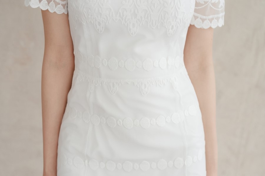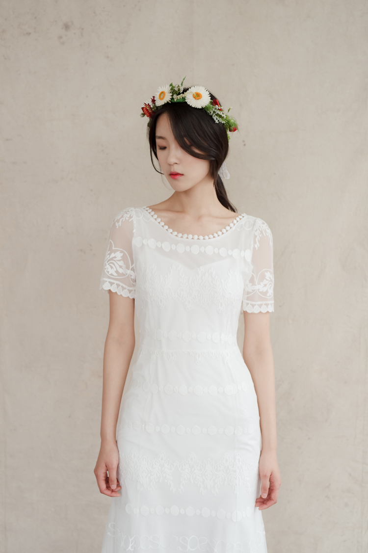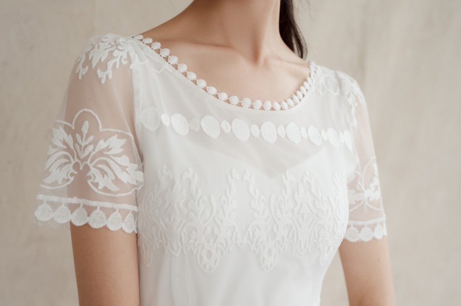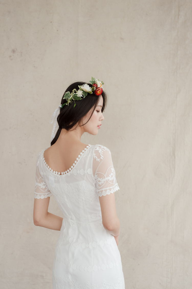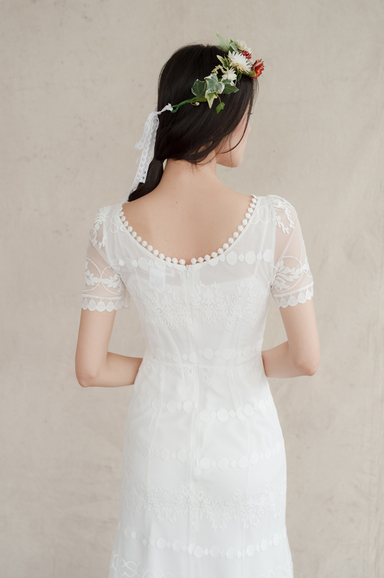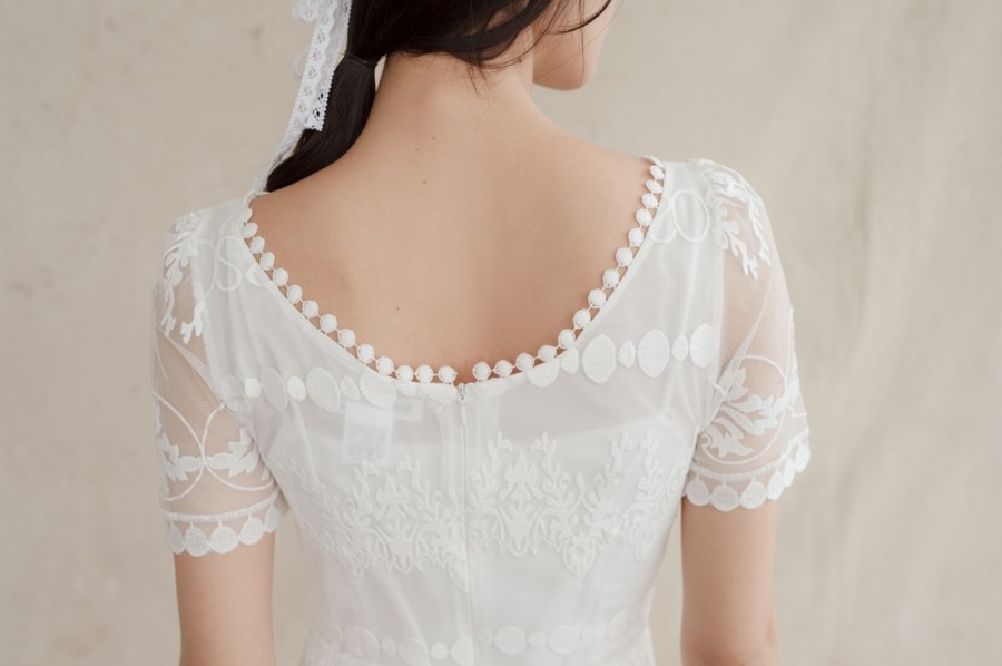 도트 레이스로 네크라인에 포인트를 주어 뒷목까지 아름답게 보여줍니다.