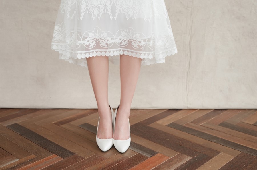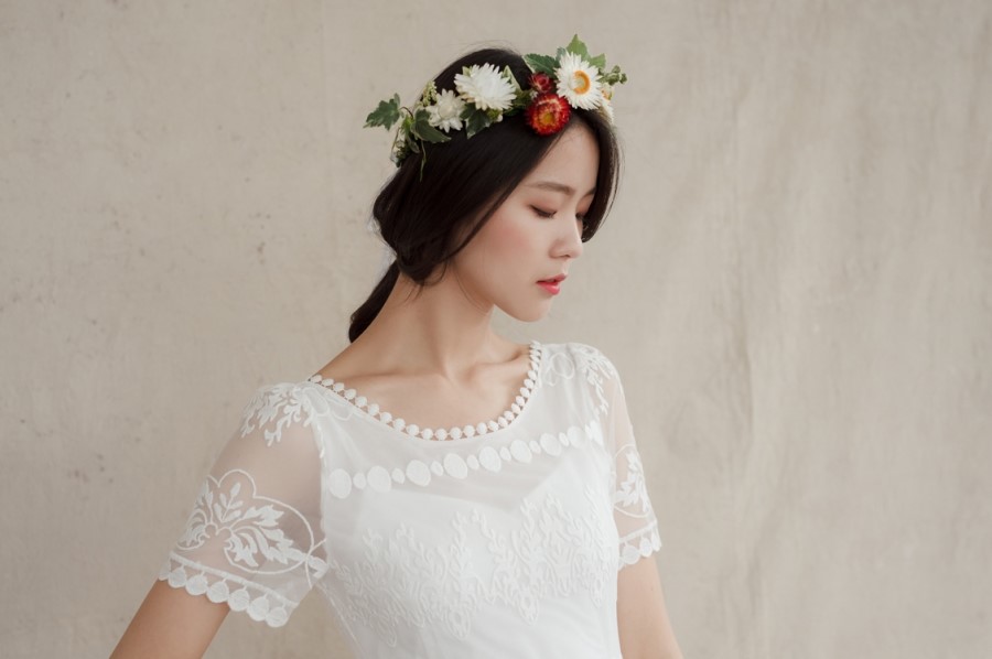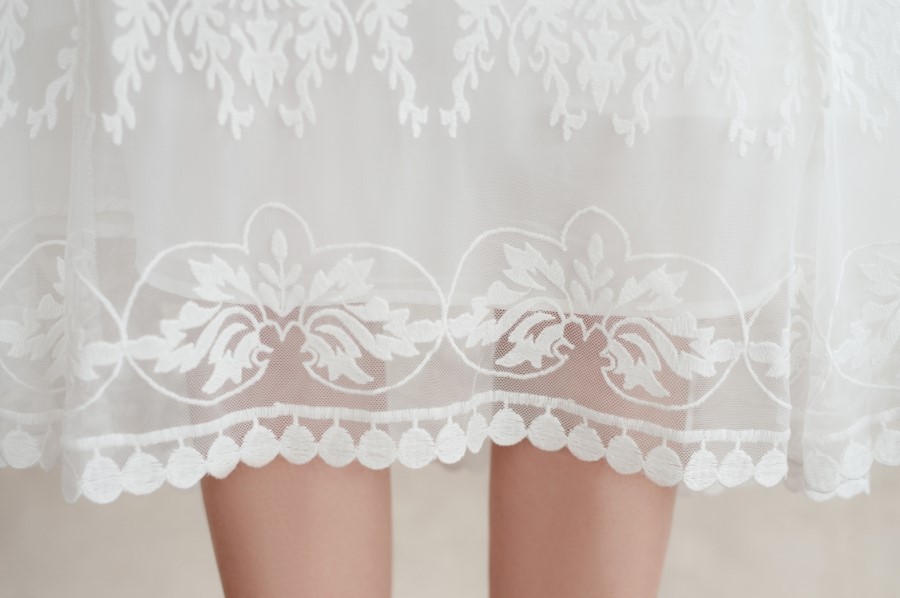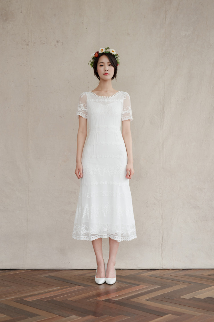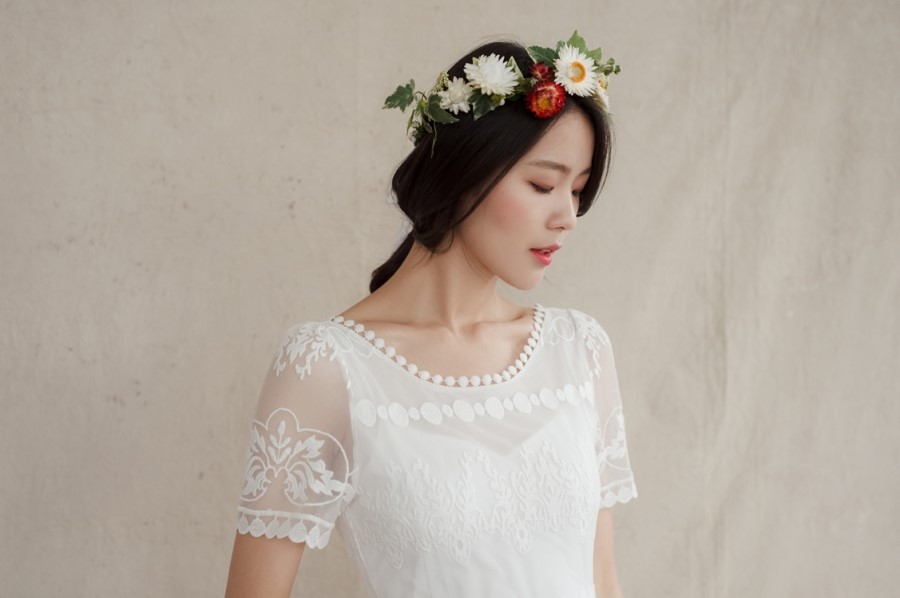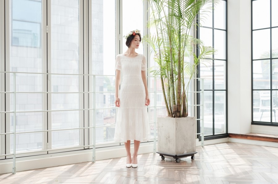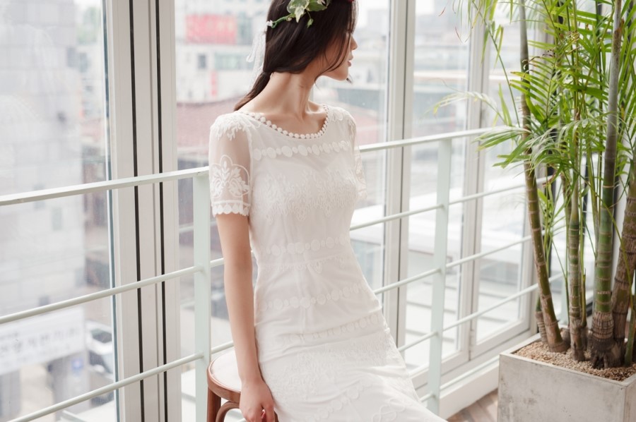 도트 레이스로 네크라인에 포인트를 주어 뒷목까지 아름답게 보여줍니다.