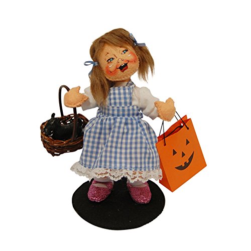 Dorothy is adorable in her blue and white checked dress over her white blouse. She is wearing white socks and sparkling shoes. With blue ribbons in her ponytails and trick or treat bag in hand, she is ready to celebrate Halloween!