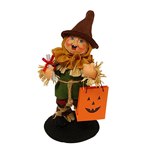 Scarecrow is adorable! He is dressed in green tunic and black pants with a gathered tan collar with a brown hat. Straw is showing at the neck area as well as the wrist and ankles. This little one is holding a Trick or Treat bag and ready to have some fun!