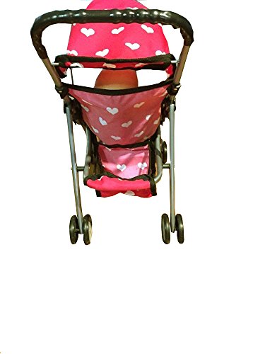 - Pink with hearts stroller with hood, seat belt, and basket on the bottom