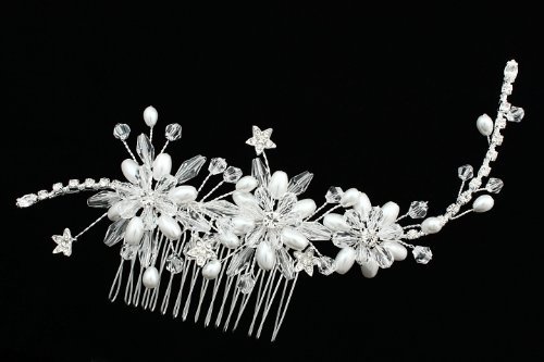 Handmade Crystal Pearl Star Burst Flower Bridal Wedding Hair Comb - Silver Plated FC042