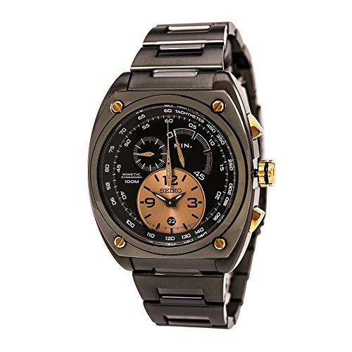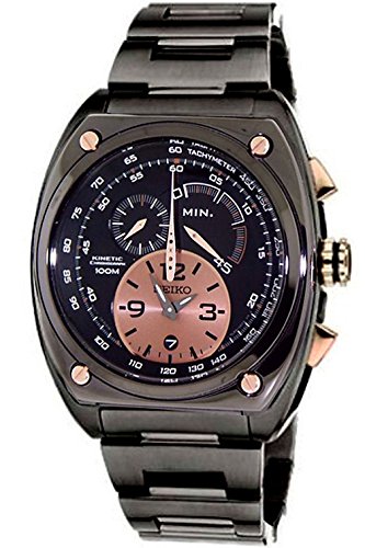 Studio : Seiko Publisher : Seiko Binding : Watch Product Description Limited Edition - 031/750 manufactured, Dress watch, Kinetic movement (wearer's movement powers battery), Power reserve indicator, Chronograph featuring 45-minute and continuous seconds subdials, Polished gunmetal-tone hands with luminous accents, Polished rose-gold-tone chronograph sweep seconds, Polished rose-gold-tone hands mark subdials, Applied glossy black Arabic numbers mark twelve, three and nine o'clock positions, Applied glossy black baton markers, White baton markers and white/orange indices mark subdials, White Arabic numbers and indices form minute track, White Arabic numbers form tachymeter scale on surrounding concave ring, Double-layer black lacquer dial with brushed rose-gold-tone subdial and black logo, Brushed black-ion-plated stainless steel bracelet with polished inserts, adjustable links and fold-over-clasp-with-safety, Polished black-ion-plated stainless steel bezel with four rose-gold-tone screws, Brushed/polished black-ion-plated stainless steel tonneau (barrel-shaped) case, Textured rose-gold-tone steel crown, Polished rose-gold-tone steel selector buttons, Stainless steel screw-down exhibition caseback, Hardlex crystal, 10 ATM (100 meters/330 feet water resistant) 0