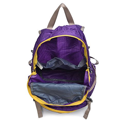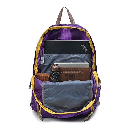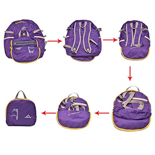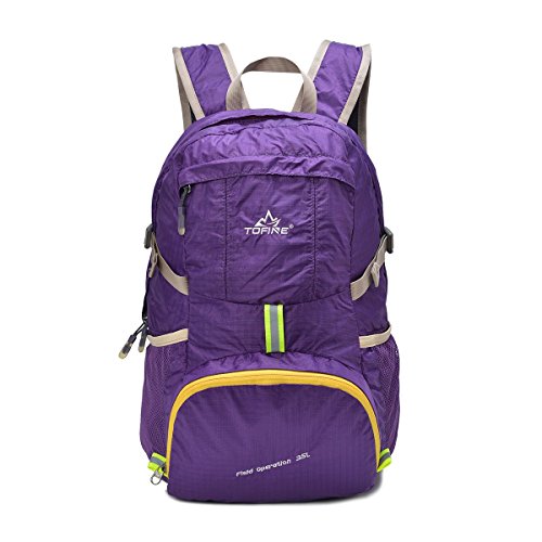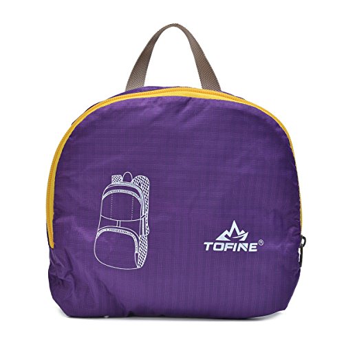 -. Brand : Tofine -. Color : Purple -. Department : unisex -. EAN : 0732330877037 -. Feature : Easy to keep on hand since it folds into its own pocket and fits in your suitcase or backpack / The shoulder strap is adjustable for a perfect fit, and can also be removed if you prefer to carry the bag in your hand / Easy to keep clean since you can wash it in the washing machine / Small and foldable but has enough space to hold everything with you / The TOFINE backpack has a great size for day-to-day wear, work, school and commuting, while the showerproof Vinylon-F fabric ensures that your stuff stays safe -. IsAutographed : 0 -. IsMemorabilia : 0 -. Label : TOFINE -. Manufacturer : TOFINE -. MPN : 8225 Purple -. NumberOfItems : 1 -. PackageQuantity : 1 -. PartNumber : 8225 Purple -. ProductGroup : Sports -. ProductTypeName : OUTDOOR_RECREATION_PRODUCT -. Publisher : TOFINE -. Size : 35 Liter -. Studio : TOFINE -. Title : TOFINE Portable Travel Foldable Waterproof Backpack Hiking Gear 35L Purple -. UPC : 732330877037