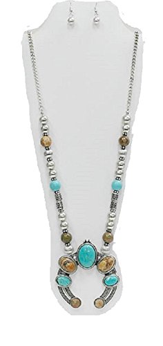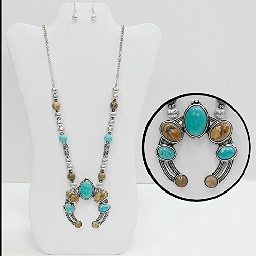 -. Feature : Squash Blossom Long Necklace Set. Size: 35"L / 2 Tone color stones / Squash Blossom Size: 3"L x 2.7"W / Rhodium plated Lobster Claw Closure / 2.5 ext Inch Necklace Length