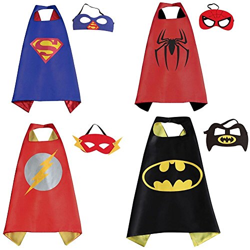 set of 4 capes and 4 mask suitable for children 3-11 years old gread for Halloween superhero party, dress up more durable sided easy velcro neck for young children perfect birthday present for children flash, spiderman,superman, Batman
